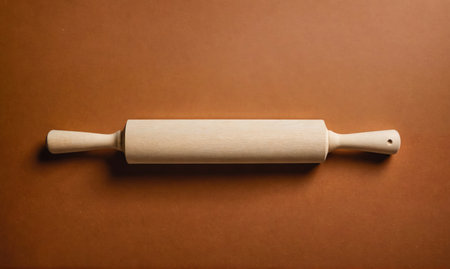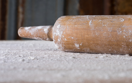 Wooden rolling pin in wheat flour on a brown background, close up.