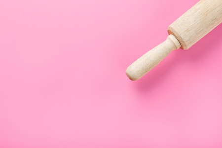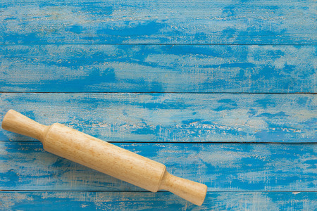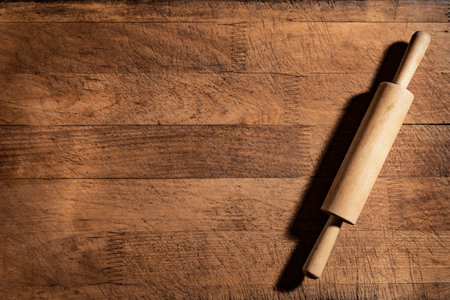 Rolling pin on wooden cutting board or kitchen table, top view, copy space. Baking or cooking concept.