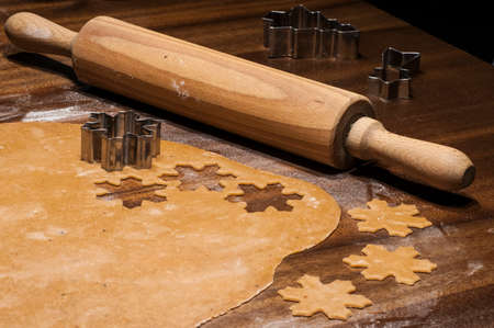 Polling pin for making gingerbread. Close-up of rolling raw dough for gingerbread. Christmas mood. Preparing for hollidays