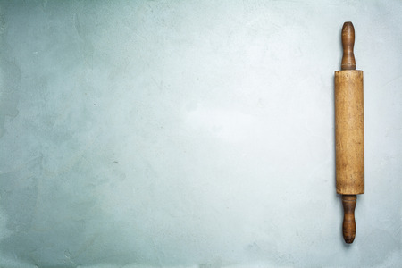 Old wooden rolling pin on rustic stone background. Top view with copy space