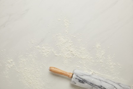 Scattered flour food and rolling pin as bakery concept for homemade bread baking on table. Recipe top view at stone background texture with copy space, flat lay concept