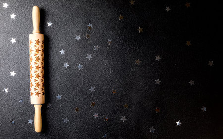 Rolling pin with a pattern in the form of stars on a black board. Baking Background .Preparation for cooking Food. Concept for Menu, Recipe, Ingredient. Copy space for Text