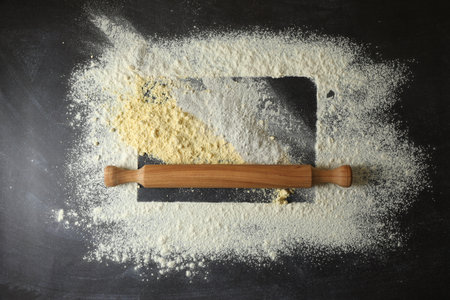 Wooden dough roller on the black table with flour spread. Bakery homemade concept.