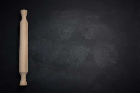 Rolling wooden pin over black wooden table, horizontal and above view with copy space for text or other design
