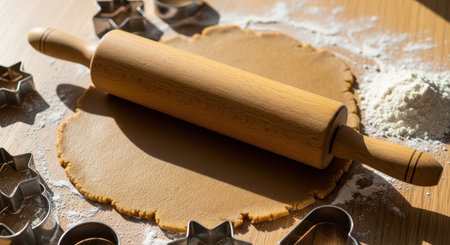 close up of a rolling pin and cutting equitment for cutting out cookies of the biscuit dough on a kitchen table with a lot of flour