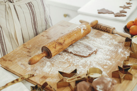 Woman making christmas gingerbread cookies in modern white kitchen close up. Hands kneading gingerbread dough with rolling pin, golden metal cutters, cooking spices, festive decorations
