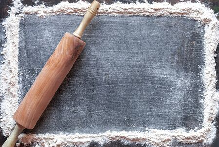 Rolling pin and white flour on a dark surface with free space for text . Top view.