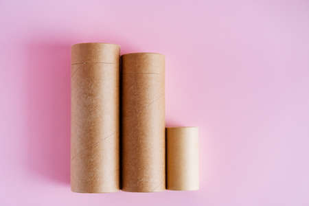 Three elongated tubes of craft paper. Cardboard packaging. Tubes for storing pencils and pens on a pink background. packing set. high quality photo