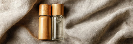 Two stylish glass containers with wooden caps are arranged on a textured beige fabric, emphasizing natural beauty and eco-conscious design elements.
