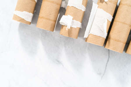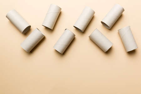 Flat lay composition with empty toilet paper rolls and space for text on color background. Recyclable paper tube with metal plug end made of kraft paper or cardboard.