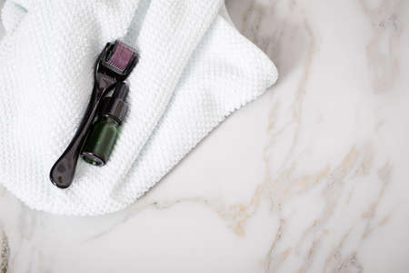 Derma roller, towel and green beauty serum dropper bottle for anti ageing lifting or acne treatment on marble background
