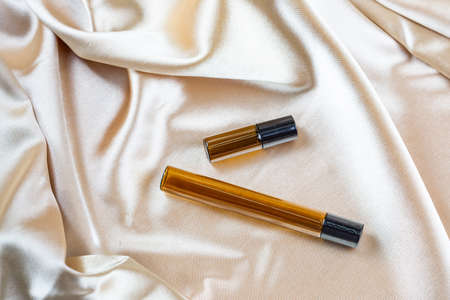 A container for storing cosmetics made of dark glass lie on the folds of a silk satin fabric. Perfume, serum or lotion bottle