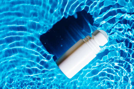White beauty product roll on antiperspirant deodorant anti sweat smell, vial in transparent fresh water with flecks and waves, dark shade. Skin care protection in hot summer beach. Flat lay.