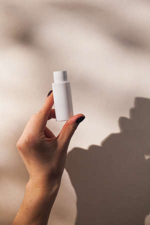 A tube of face and body care cosmetics in a womans hand with hard shadows on the background. Beauty concept. Copy space