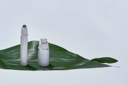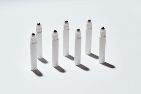 Tubes for eye roller beauty product isolated over white background with reflection