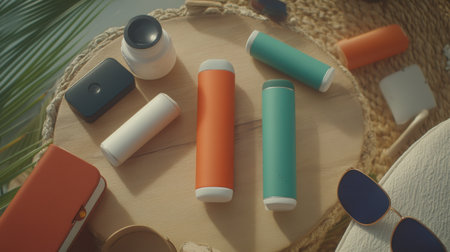 A collection of vibrant portable drink containers rests on a natural wood surface, complemented by elegant sun protection products and trendy accessories, ideal for a summer outing.