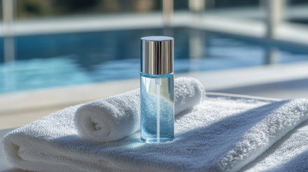 A serene setting featuring a blue cosmetic bottle resting on soft white towels, with a tranquil pool in the background, perfect for beauty and wellness promotions.