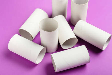 Toilet paper cardboard tubes on purple background, closeup