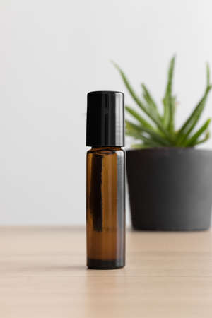 Amber glass roll-on bottle mockup with a succulent plant on the wooden table.