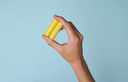 Hand holds aa batteries on blue background