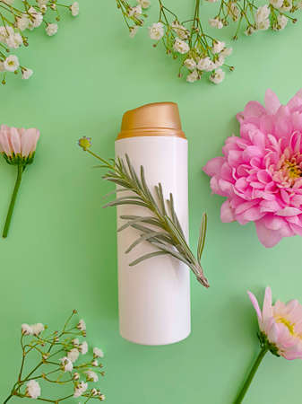 Cosmetic bottle with white daisy flowers on a gray background.