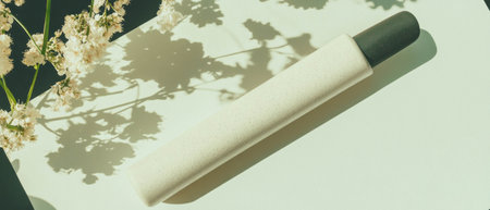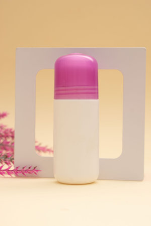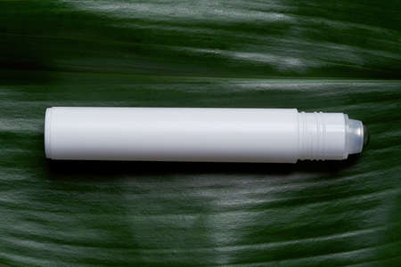Roller cosmetic tube on a light pink surface close-up. Natural organic cosmetics concept.