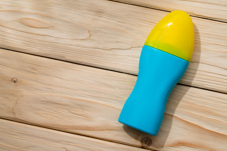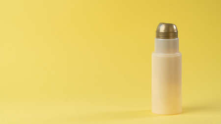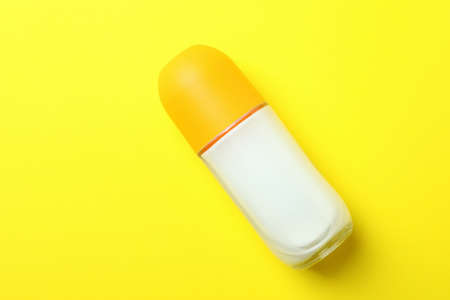 Body antiperspirant deodorant roll-on on yellow background, space for text