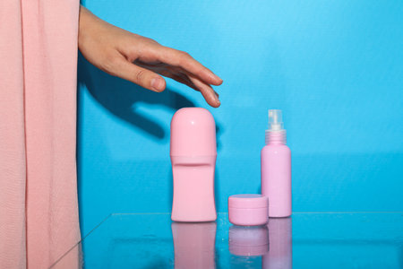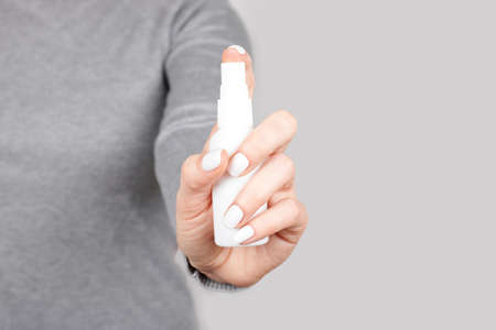 A woman is holding antiperspirant. Place for your text. The concept of hazardous substances in cosmetics and household chemicals
