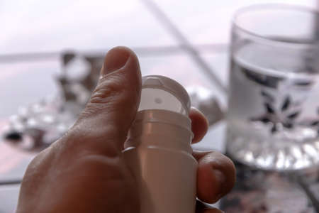 A blue antiseptic with a spray of sperm solution is located in human hands on a white matte background.