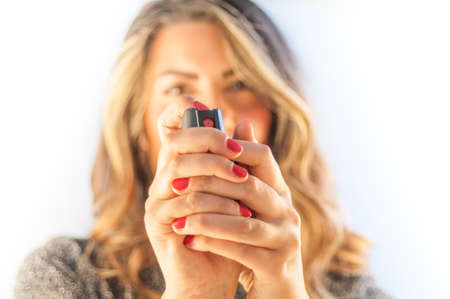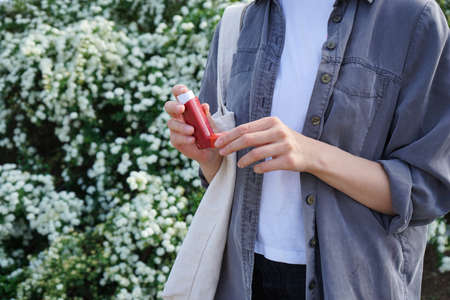 Female hands holding asthma inhaler on attack outdoor, health and medical concept.
