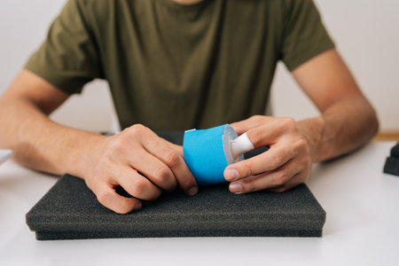 Packing with wrap and duct tape, package for shipping, male hands wrapping, isolated on black background, top view