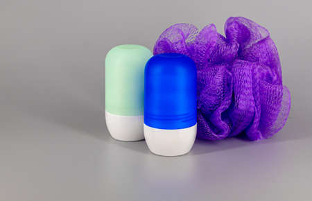 Roll On deodorant - Two plastic container with sphere applicator, Blue and Turquoise witha a shower or bath sponge in nylon for scrub on a neutral background - Isolated