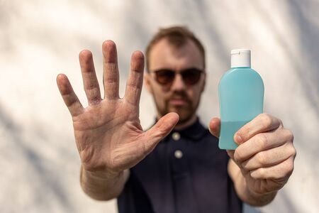 Hand sanitizer alcohol gel rub clean hands hygiene prevention of coronavirus virus outbreak. Man showing one hand and holding a bottle of antibacterial sanitiser soap. Uses On The Street.