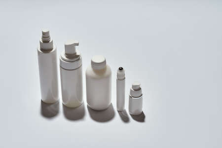 Set of different white bottles for beauty products arranged in the descending order of height isolated over white background with reflection