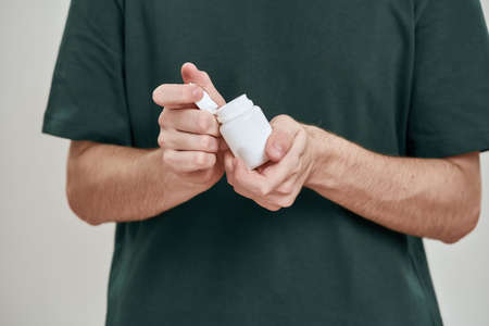pillbox in a man's hand on a background of blisters and a glass of water, short focus, toning