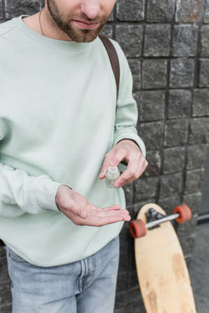 Man disinfecting his hands with blue hand sanitizer from a bottle on brick background
