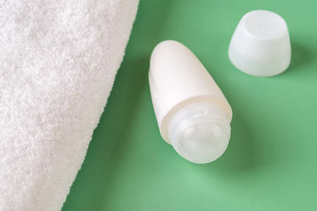 Open roll on antiperspirant deodorant and white bath towel over green background. Body care, toiletries, purity and personal hygiene items concepts. Cosmetics to reduce perspiration. Close-up.
