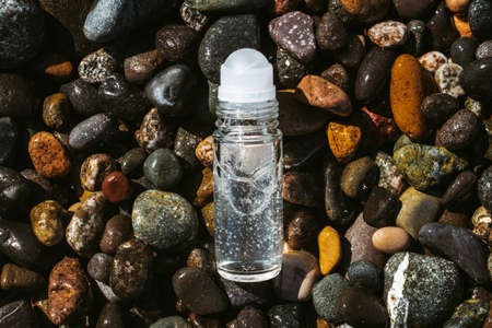 Flat lay composition of a roll on transparent deodorant bottle on wet beach stones . Fresh ocean scented product mock up.