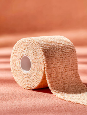 A gentle, pastel pink backdrop highlights a plush, pliable roll of adhesive bandage material, suggesting comfort and care in medical applications.