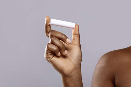Lip Care Concept. Black female hand holding white blank hygienic moisturizing lipstick, isolated over gray background, unrecognizable african woman demonstrating new cosmetic product, copy space