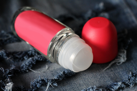 White deodorant in the glass bottle on the dark blue cloth background with copy space. Summer still life