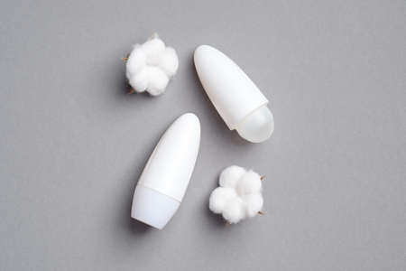 Deodorant packaging mockup with cotton. Blank antiperspirant bottles, sweat protection concept. Flat lay, top view