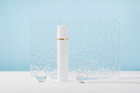 Unbranded cosmetic cream plastic tube mockup on blue background with stylish props, glass balls and acrylic plate. Lotion, concealer or white beauty product packaging. Product presentation mock up