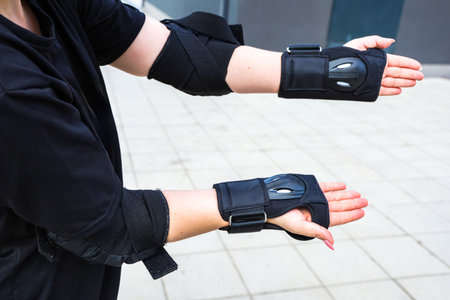 A person showcases protective wrist and elbow gear while standing on a tiled surface indicating readiness for outdoor sports or activities.