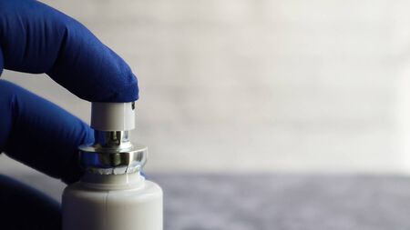 A gloved hand presses on an aerosol protective antiseptic, disinfectant on a white background. Health hygiene protection against viruses, bacteria, flu and coronavirus. copy space.