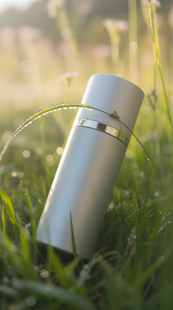 A close-up captures a cosmetic bottle, featuring a gold cap and frosted glass body, resting on a textured fabric. The scene is illuminated by soft light, casting shadows and highlighting the fabric's subtle details. This image is suitable for use in advertising, product presentation, or lifestyle-themed publications.
