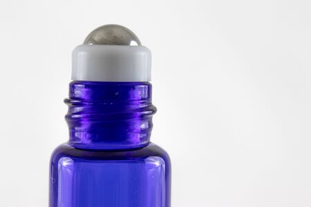 Blue glass roller ball bottle with metal roller ball for essential oils, massage oils or beauty or wellness serums.