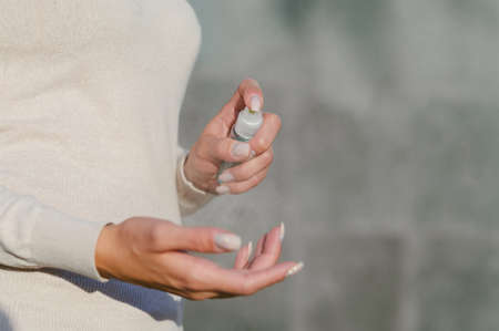 Girl Disinfects her hands with Antiseptic. Against the background of a gray concrete wall