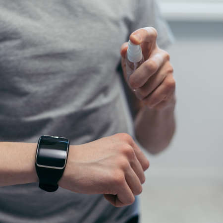 Applying alcohol sanitizer spray or antibacterial spray at arm to prevent spread of virus, bacteria and coronavirus. Personal hygiene disinfectant concept. clean hands
