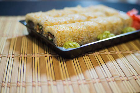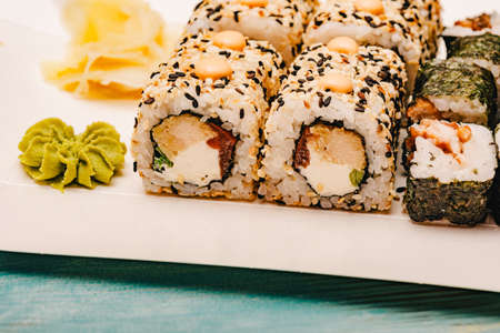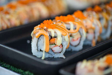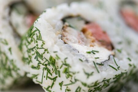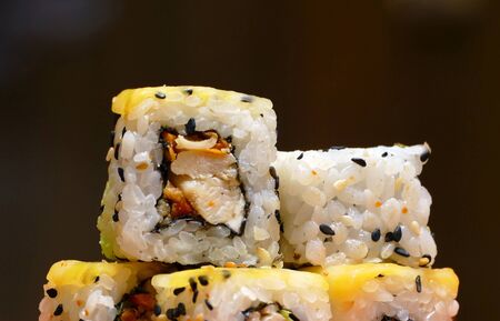 Sushi rolls, Close up. Maki sushi rolls Japanese food Rolls. japanese rice seafood meal maki